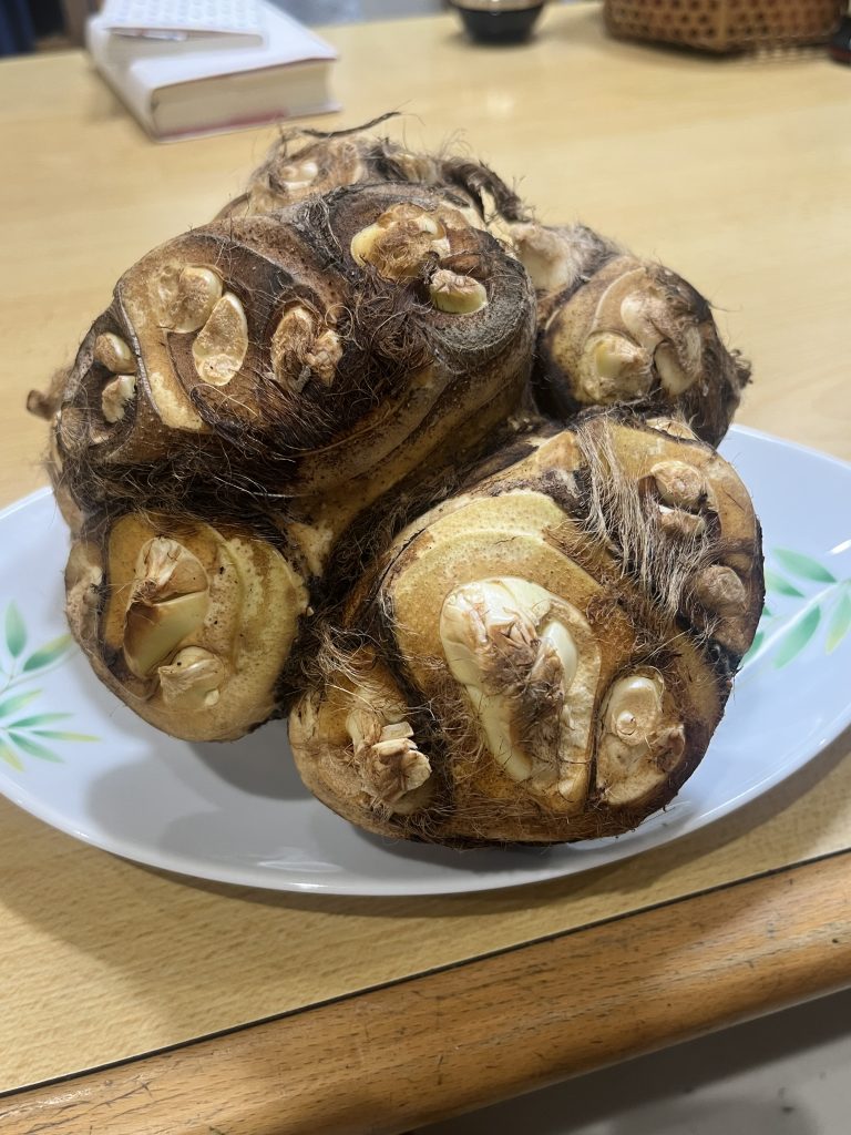 また、面白い漢字を教えてもらいました。「八ツ頭(やつがしら)」という漢字です。陽子先生が買ってきた芋で、飾ってもいいし、食べられるそうです。頭が8個あるの?と驚きました。